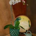 The Process: I set up a composition incorporating three elements: an orchid in a decorative pot, a small celadon teapot and a ceramic Asian plate in plate stand. The photograph, shown on the left, was taken outdoors against an adobe wall. After transferring the image onto watercolor paper, I added graphite details and shadows to the pot and the wood-grain tabletop. I applied liquid frisket to mask the white orchid blossoms and some of the lightest highlights on the pot, plate and rim of the teapot. Using a mixture of Burnt Sienna, French ultramarine and sepia, I applied several washes to the background walls and a lighter wash to the tabletop. To create the celadon color of the teapot, I used a mixture of Naples yellow and Cobalt blue. I applied a light wash of the celadon mix to the teapot and a second wash after removing the frisket. After adding more Cobalt blue to the mixture, I applied several washes of color to the decorative pot, adding dark shadows under the rim and the diamond-shaped insets; the same color was used in the abstract design on the plate. The plate was completed using a light wash of Naples yellow with a wash of Burnt Sienna along the rim. Lastly, I painted the leaves and flowers of the orchid plant after removing the frisket. By adding a bit of Gum Arabic to the shades of green paint, the leaves took on a glossy glow. The delicate orchid flowers were completed with touches of white gouache, a mixture of Alizarin crimson and gouache, and touches of grey to outline the pedals, while leaving some of the white paper show through as the brightest highlights.
